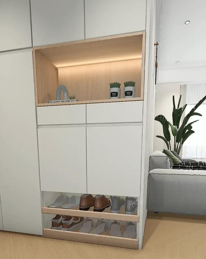 旁边做组合型定制鞋柜。鞋柜正面做开放式鞋格,放常穿的拖鞋、运动鞋,早上出门一眼找到,不用翻来翻去;