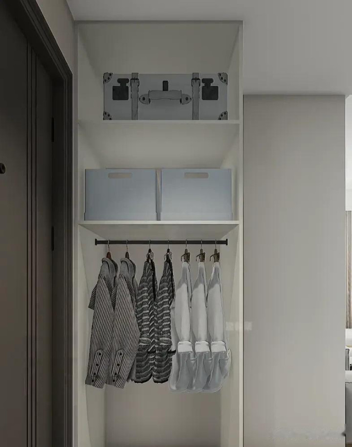 别让门边空间空着,做一组加厚高柜才实用。高柜顶部空间别浪费,放行李箱、换季收纳箱等闲置物品,不占日常使用空间;柜体中间留空装挂衣杆,回家随手挂外套、围巾、通勤包,再也不用把衣服扔沙发;