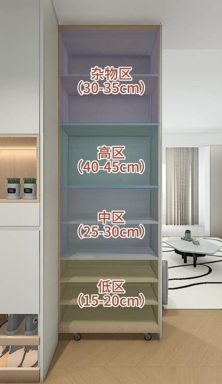 按鞋子高度划分成低、中、高三个区域:低区放拖鞋、平底鞋,中区放运动鞋、短靴,高区放马丁靴、长靴,不管是孩子的小鞋还是大人的高筒靴,都能找到合适位置;