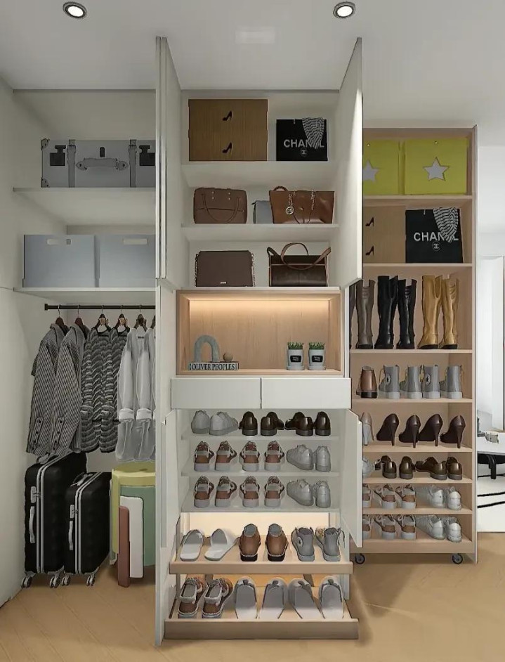 很多人家里入户垭口明明够宽,却只做个常规鞋柜 —— 大块空间白白浪费,开放柜只能放小零碎,外套没处挂、高鞋放不下,越用越憋屈。